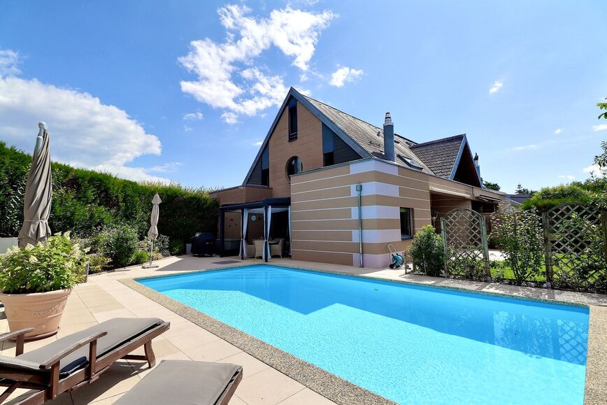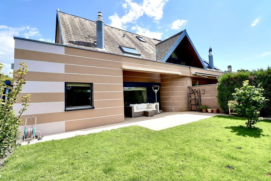 Le rez-de-chaussée s'ouvre sur un hall d’entrée accueillant, un vaste séjour chaleureux avec poêle suédois, une cuisine moderne entièrement équipée ainsi qu’un WC visiteurs. À l’étage, vous découvrirez quatre belles chambres, quatre salles de bains ainsi que deux balcons qui invitent à la détente.