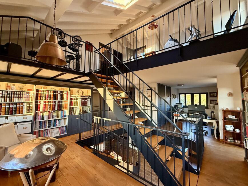 Un élément central attire immédiatement l’attention : un escalier magistral, à la manufacture impressionnante, trône au cœur de la maison. Véritable pièce d’architecture, il structure les volumes et vous conduit avec style et fluidité aux deux étages supérieurs.